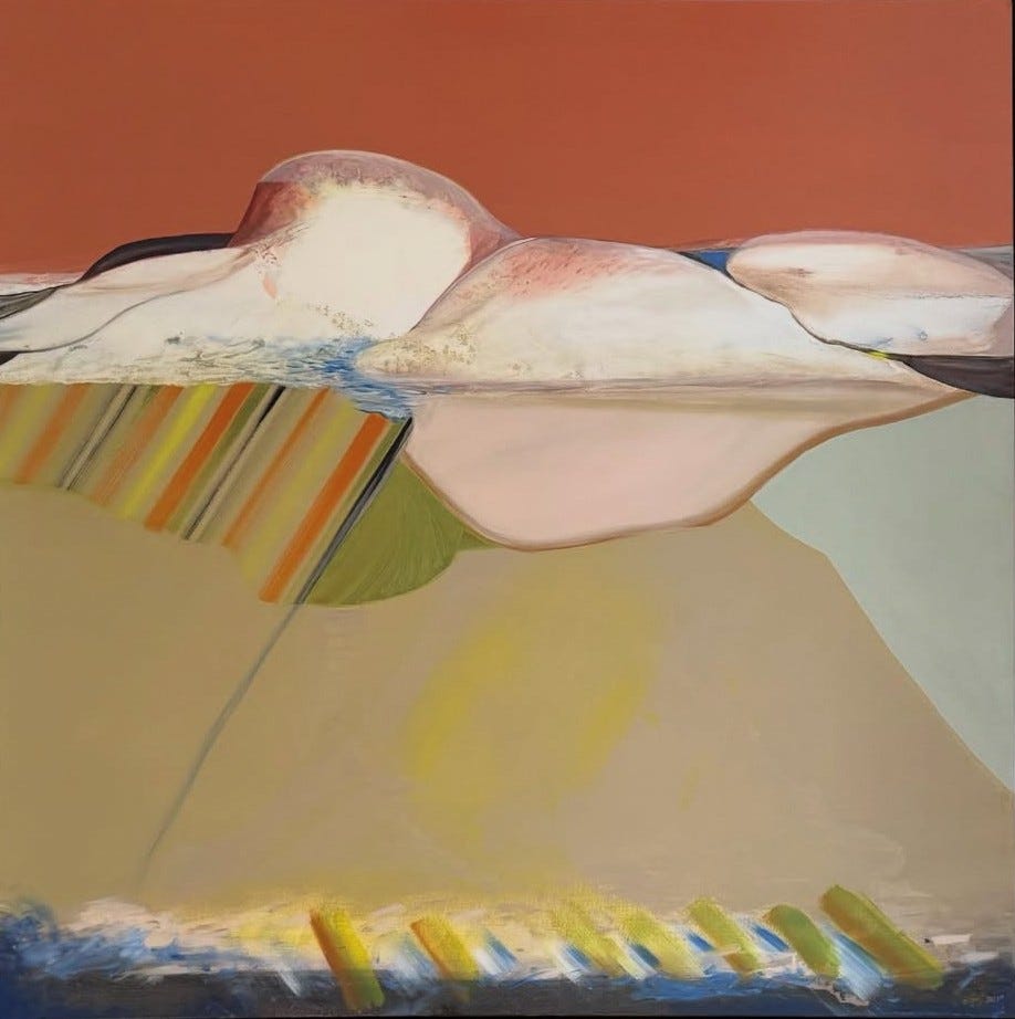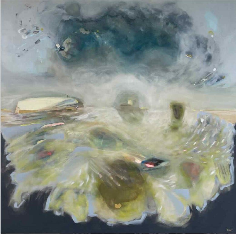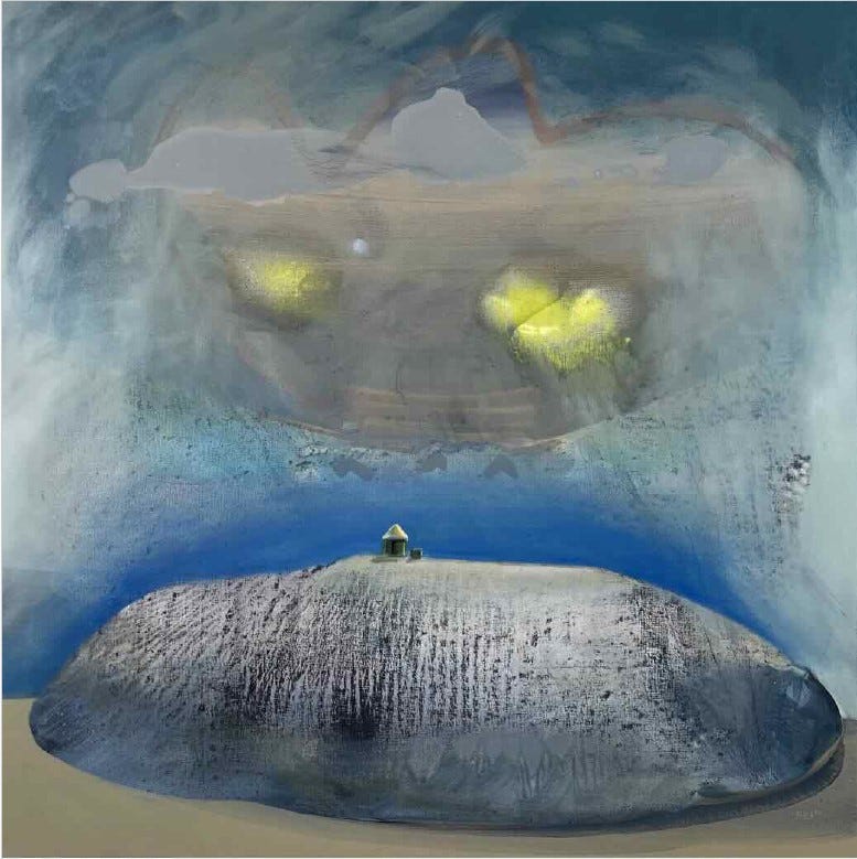 After a few trips to Monhegan Island in Maine I started to practice bilocation and lucid dreaming. I have been fortunate enough to visit very ancient energies which I am sensitive to. I have traveled to places seeking out the darkest skies to sleep under a bed of stars. I love the feeling of being a tiny spec in the great vastness of it all. Some of my paintings explore the idea of being alone but also connected to everything. Feeling like you are one the edge of a cliff with a great ocean ahead, a precipice, or embarking on a long journey.